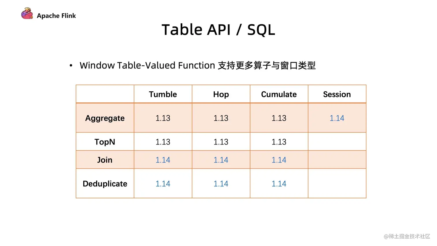 Window Table-Valued Function 支持更多算子与窗口类型 ,可以看如下表格的对比: