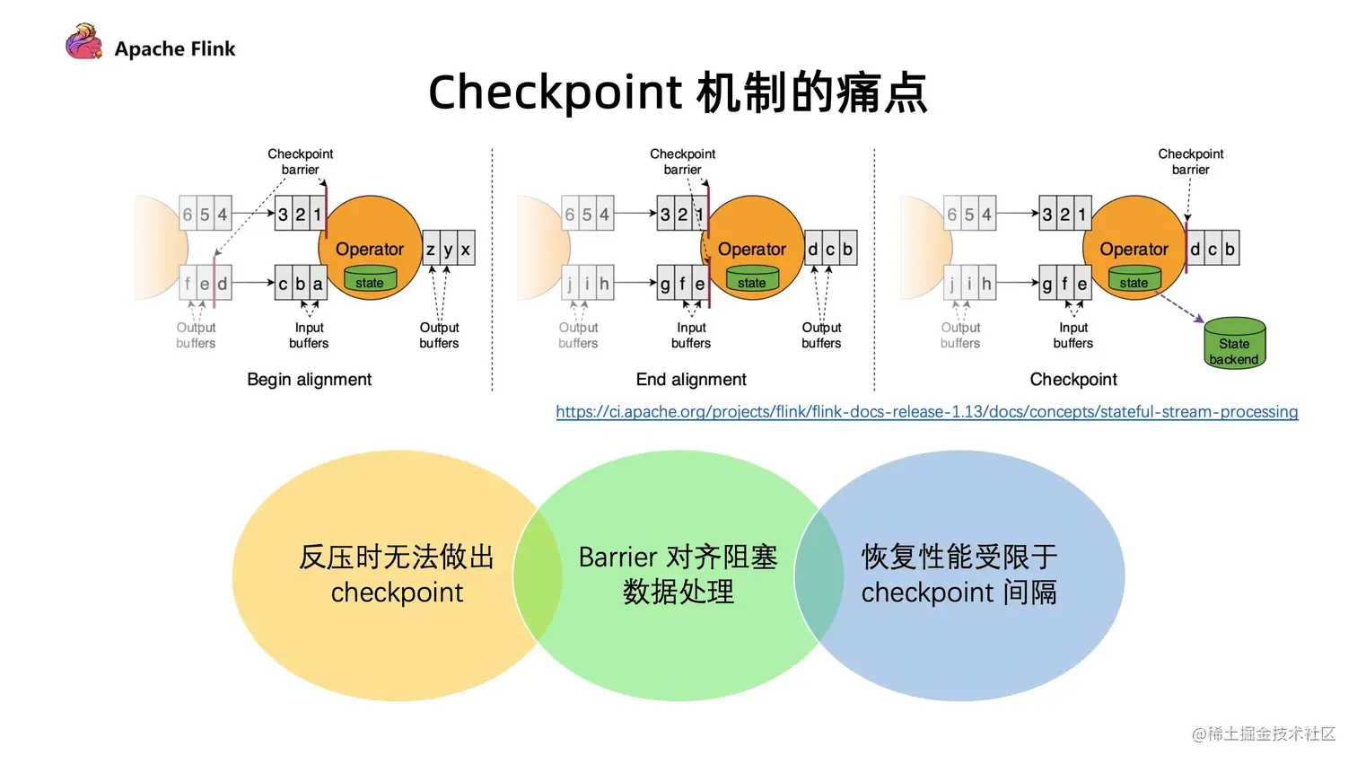 - **反压时无法做出 Checkpoint :**在反压时候 barrier 无法随着数据往下游流动,造成反压的时候无法做出 Checkpoint。但是其实在发生反压情况的时候,我们更加需要去做出对数据的 Checkpoint,因为这个时候性能遇到了瓶颈,是更加容易出问题的阶段;