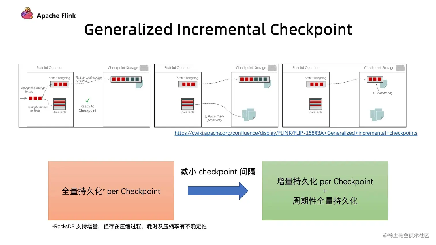 这两个过程进行拆分后,就有了从之前的需要做全量持久化 (Per Checkpoint) 变成 增量持久化 (Per Checkpoint) + 后台周期性全量持久化,从而达到同样容错的效果。在这个过程中,每一次 Checkpoint 需要做持久化的数据量减少了,从而使得做 Checkpoint 的间隔能够大幅度减少。