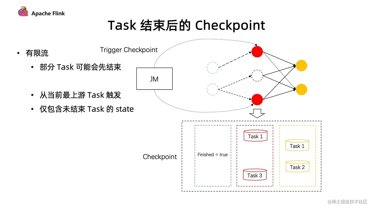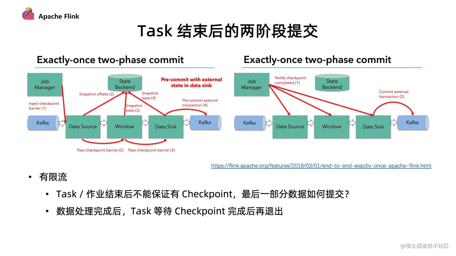 在 1.14 中,这个问题得到了解决。Task 处理完所有数据之后,必须等待 Checkpoint 完成后才可以正式的退出,这是流批一体方面针对有限流任务结束的一些改进。
