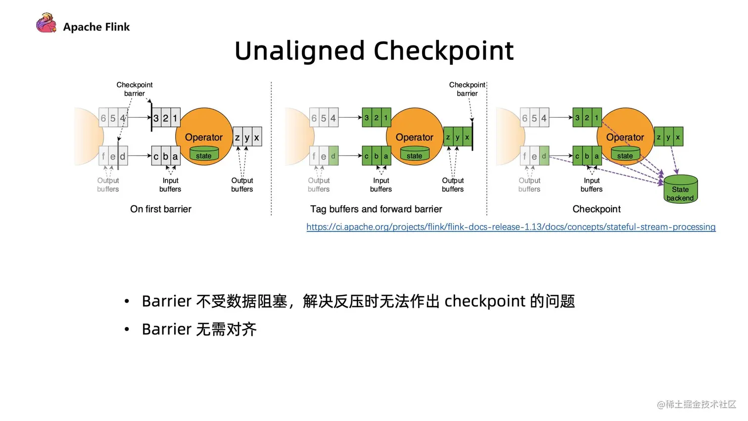 通过这种方式整个在做 Checkpoint 的时候,也不需要对 barrier 进行对齐,唯一需要做的停顿就是在整个过程中对所有 buffer 和 state 标注。这种方式可以很好的解决反压时无法做出 Checkpoint ,和 Barrier 对齐阻塞数据影响性能处理的问题。
