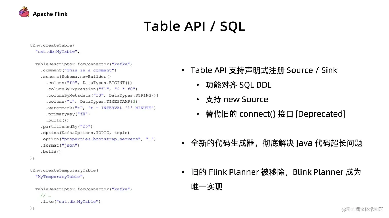 - Table API 支持使用声明式的方式注册 Source / Sink 功能对齐 SQL DDL;
