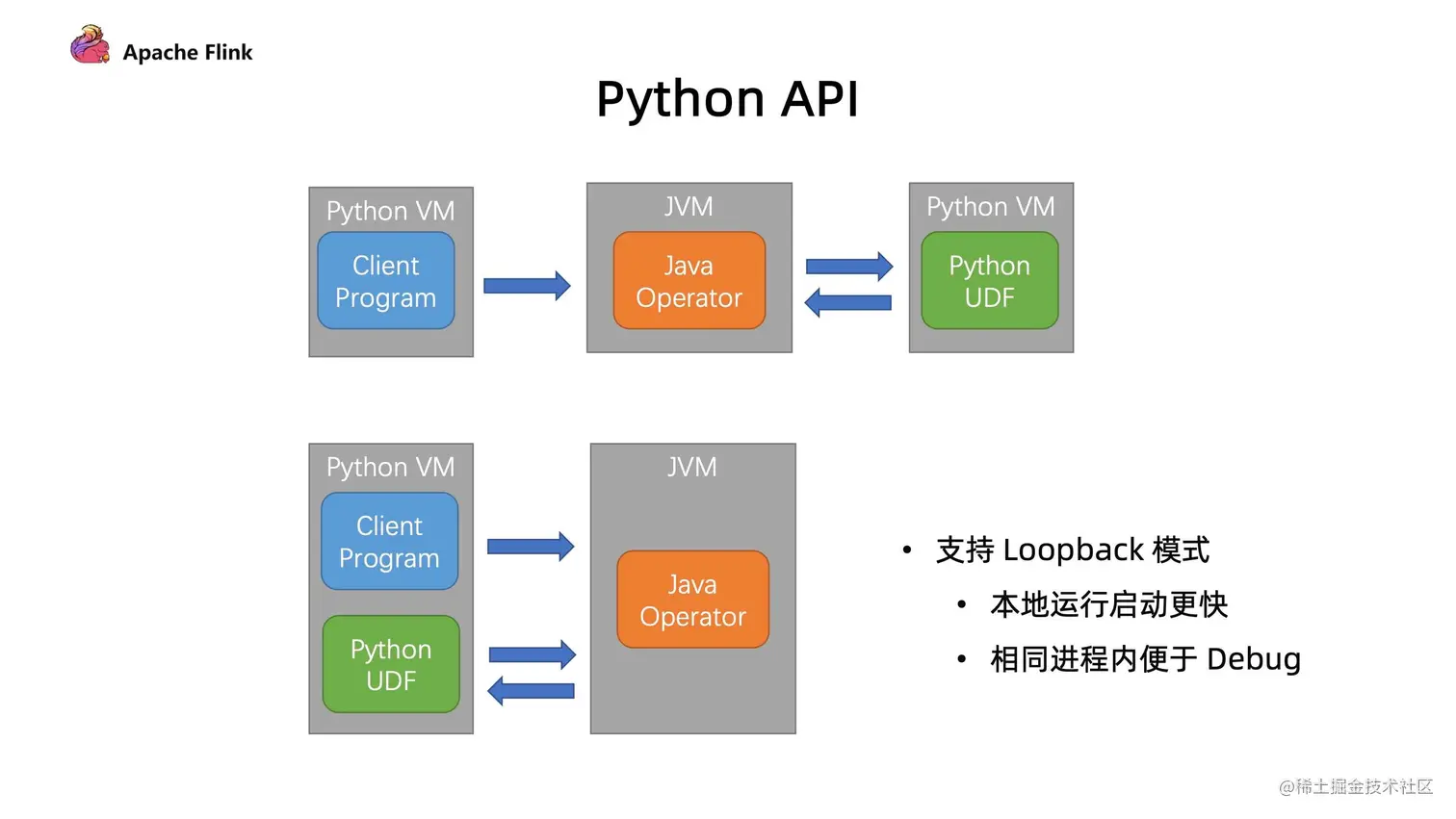在以往本地执行实际是在 Python 的进程中去运行客户端程序,提交 Java 进程启动一个迷你集群去执行 Java 部分代码。Java 部分代码也会和生产环境部分的一样,去启动一个新的 Python 进程去执行对应的 Python UDF,从图下可以看出新的进程其实在本地调试中是没有必要存在的。