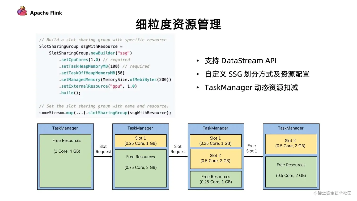 这样做的好处是不会像之前那样有固定资源的 Slot,而是做资源的动态扣减,通过这样的方式希望能够达到更加精细的资源管理和资源的使用率。