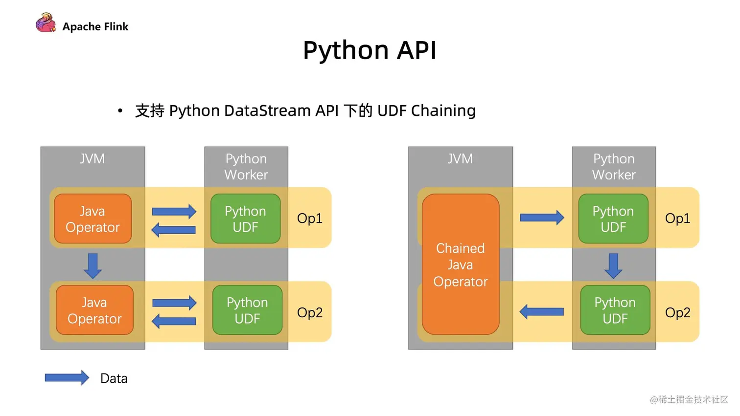 在 1.14 版本中,改进如右图,可以把它们连接在一起,只需要一个来回的 Java 和 Python 进行数据通信,通过减少传输数据次数就能够达到比较好的性能上的提升。