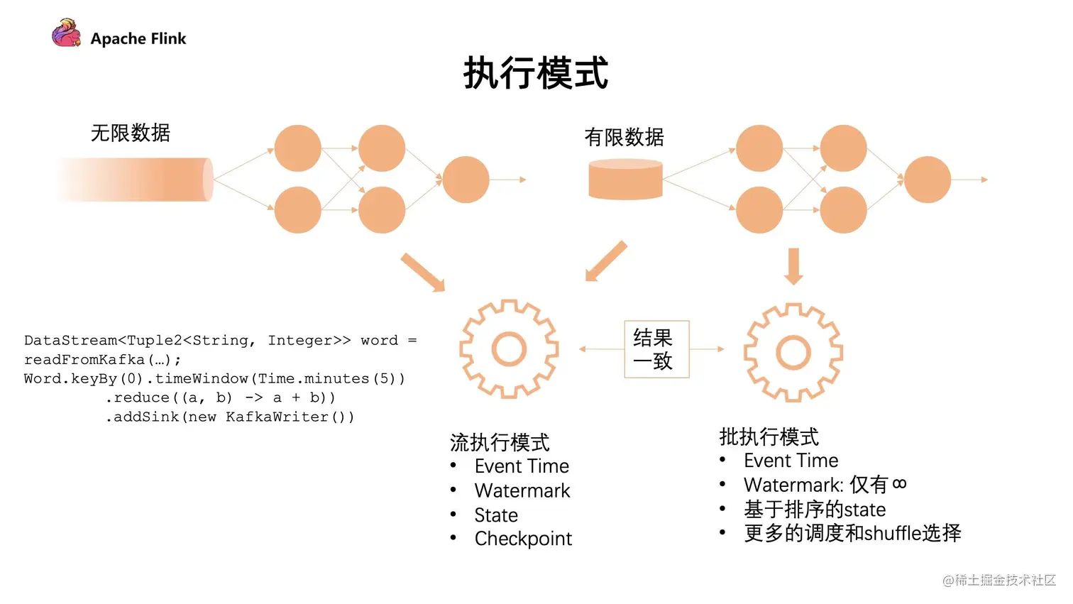 - 对于有限的数据集有 2 种执行模式,我们可以把它看成一个有限的数据流去做处理,也可以把它看成批的执行模式。批的执行模式虽然也有 eventTime,但是对于 watermark 来说只支持正无穷。对数据和 state 排序后,它在任务的调度和 shuffle 上会有更多的选择。流批的执行模式是有区别的,最主要的就是批的执行模式会有落盘的中间过程,只有当前面任务执行完成,下游的任务才会触发,这个容错机制是通过 shuffle 进行容错的。这 2 者也各有各的执行优势:对于流的执行模式来说,它没有落盘的压力,同时容错是基于数据的分段,通过不断对数据进行打点 Checkpoint 去保证断点恢复;然而在批处理上,因为要经过 shuffle 落盘,所以对磁盘会有压力。但是因为数据是经过排序的,所以对批来说,后续的计算效率可能会有一定的提升。同时,在执行时候是经过分段去执行任务的,无需同时执行。在容错计算方面是根据 stage 进行容错。这两种各有优劣,可以根据作业的具体场景来进行选择。