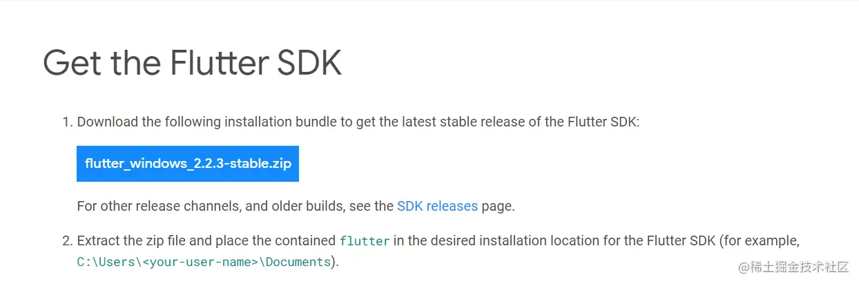 您可以从正式的 Flutter 安装文档中下载 Flutter SDK 的最新稳定版本。目前 windows 的稳定版本是 2.2.3-stable,当你阅读这篇博客时可能会有所不同。下载当时可用的最新版本。