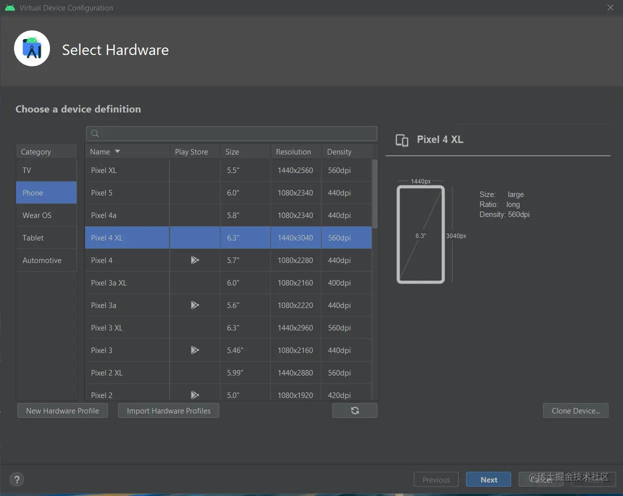 - 选择一个你喜欢的 Andriod 设备,然后点击下一步