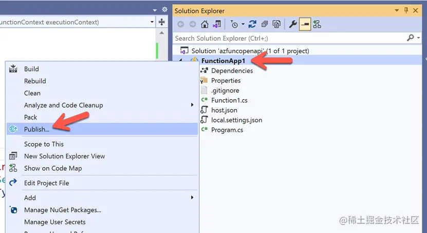 你确认你的 Azure Function 应用工作正常。现在需要部署该项目。首先,单击解决方案资源管理器中的"发布"菜单。