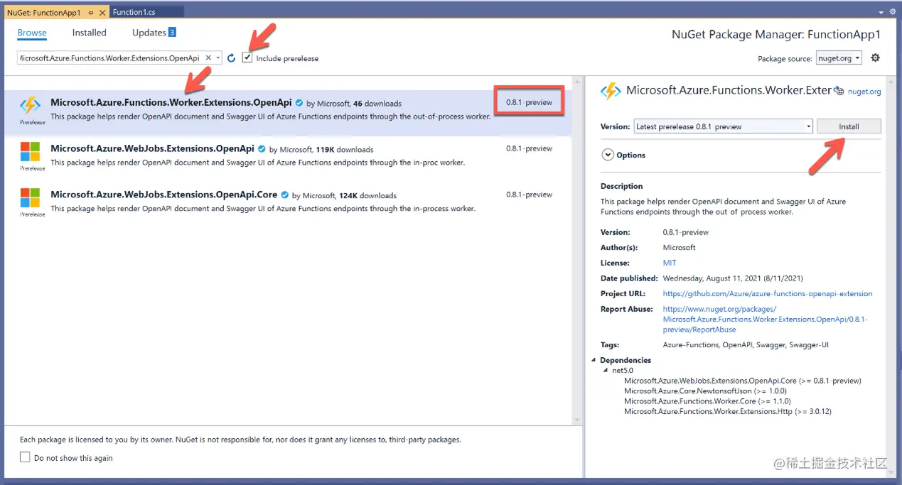 在NuGet包管理器屏幕中,勾选"包括预发布"复选框,然后搜索Microsoft.Azure.Functions.Worker.Extensions.OpenApi包。在撰写本文时,NuGet打包程序版本是v0.8.1-preview。