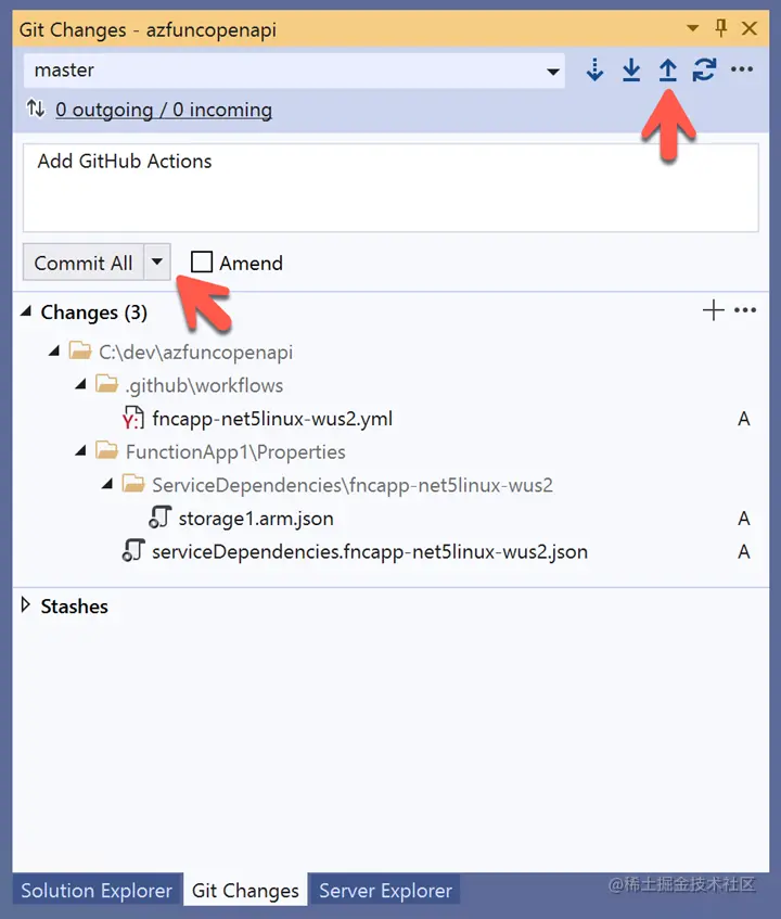 移至"Git Changes"窗格,输入如下所示的提交消息,单击"Commit All"按钮,然后推送更改。