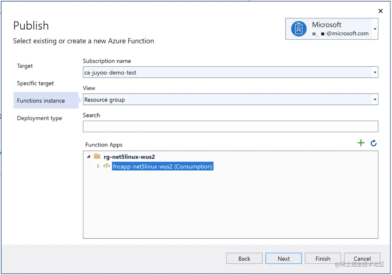 您可以使用现有的 Function 应用程序实例或通过单击 :heavy_plus_sign: 按钮来创建一个新的应用程序实例。 这一次,让我们使用当前实例。