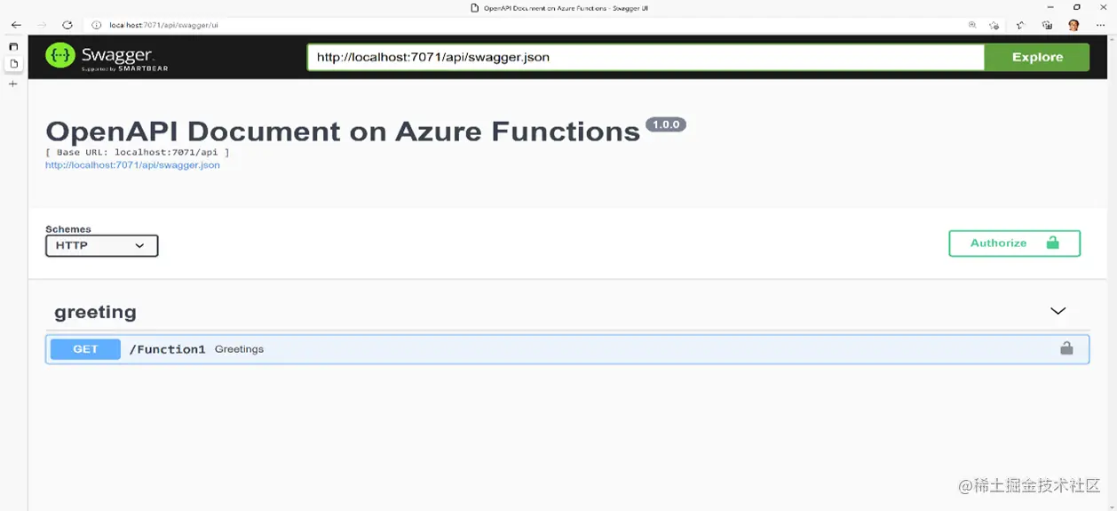 在web浏览器上运行http://localhost:7071/api/swagger/ui端点,您将看到Swagger UI页面。