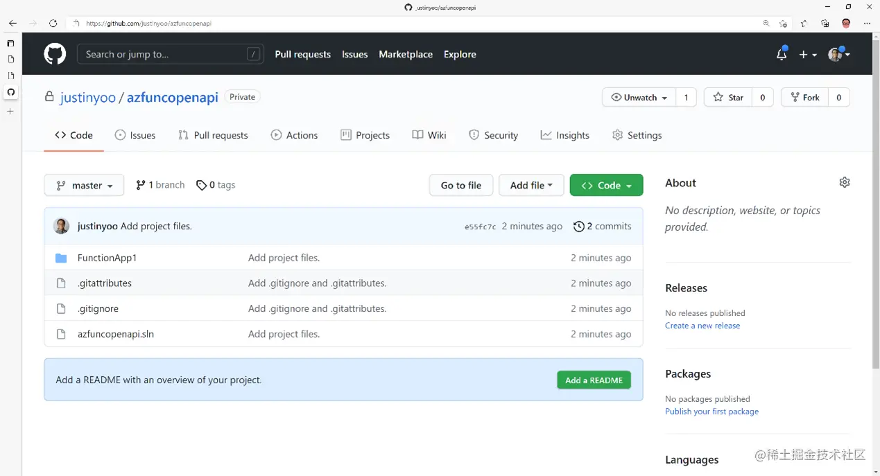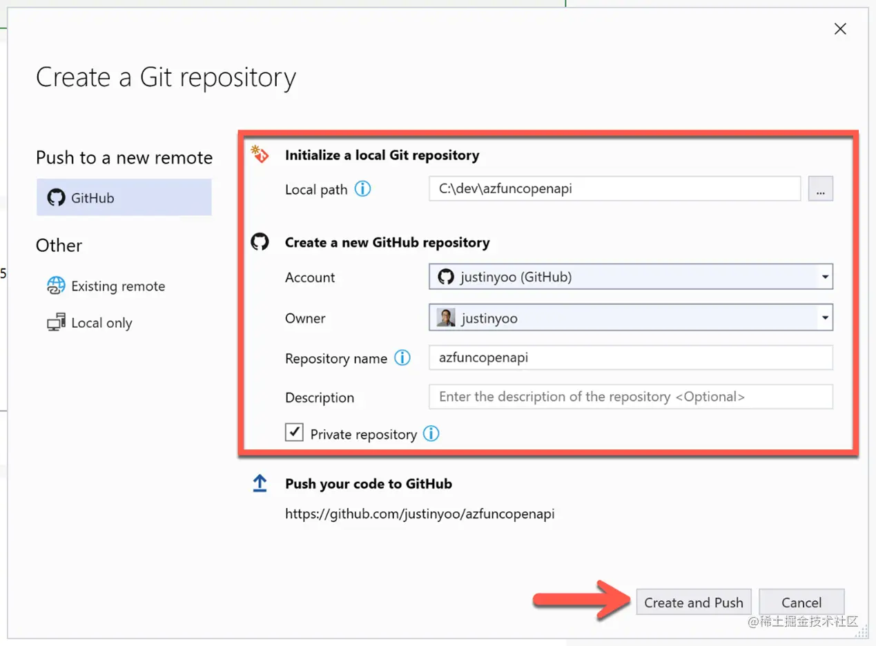 如果你已经在Visual Studio中登录了GitHub,你就可以创建一个存储库并推送代码。
