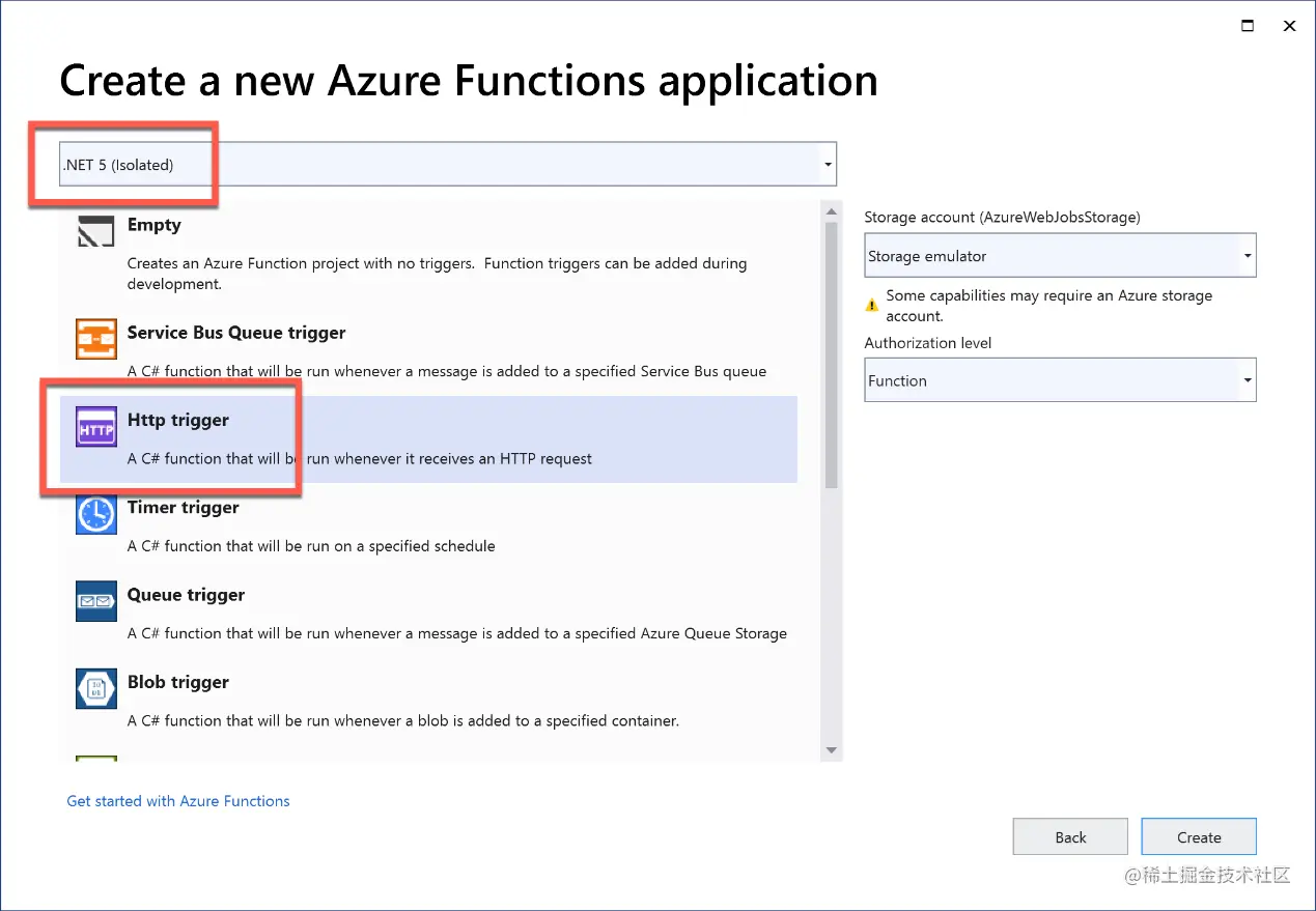 让我们使用Visual Studio来完成这个练习。在创建应用程序时,使用".NET 5(隔离)"运行时和"Http触发器"。