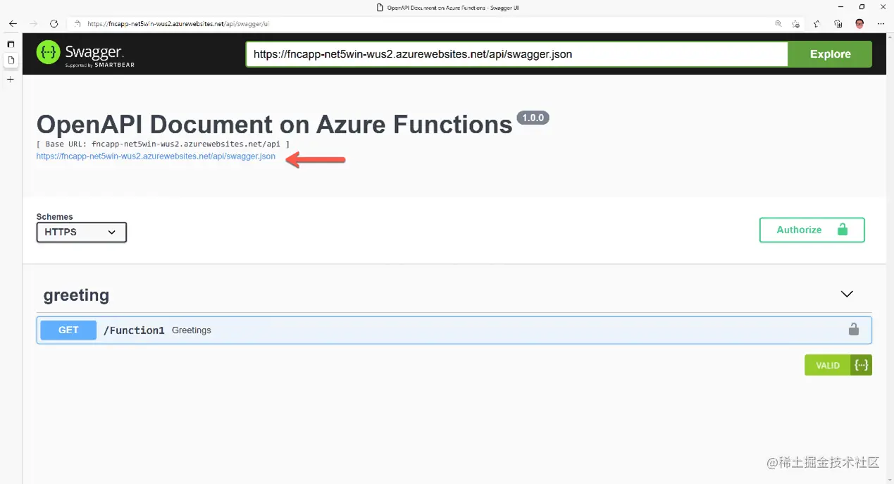 一旦部署结束,打开一个新的web浏览器,访问Azure Functions应用程序URL,并发现Swagger UI页面被正确地呈现。