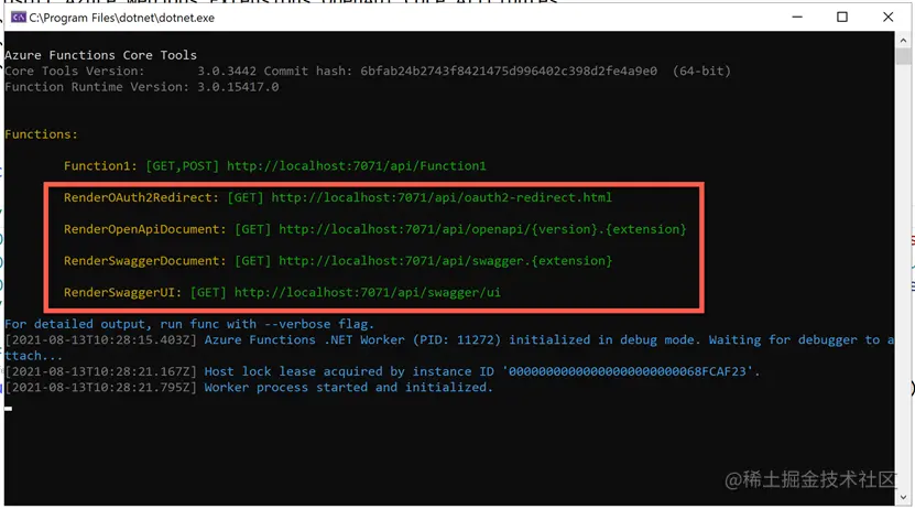 然后,按此顺序添加ConfigureFunctionsWorkerDefaults(worker => worker. usenewtonsoftjson())和ConfigureOpenApi()方法。第一个方法明确声明要使用Newtonsoft.Json包,下一个导入额外的OpenAPI相关端点。