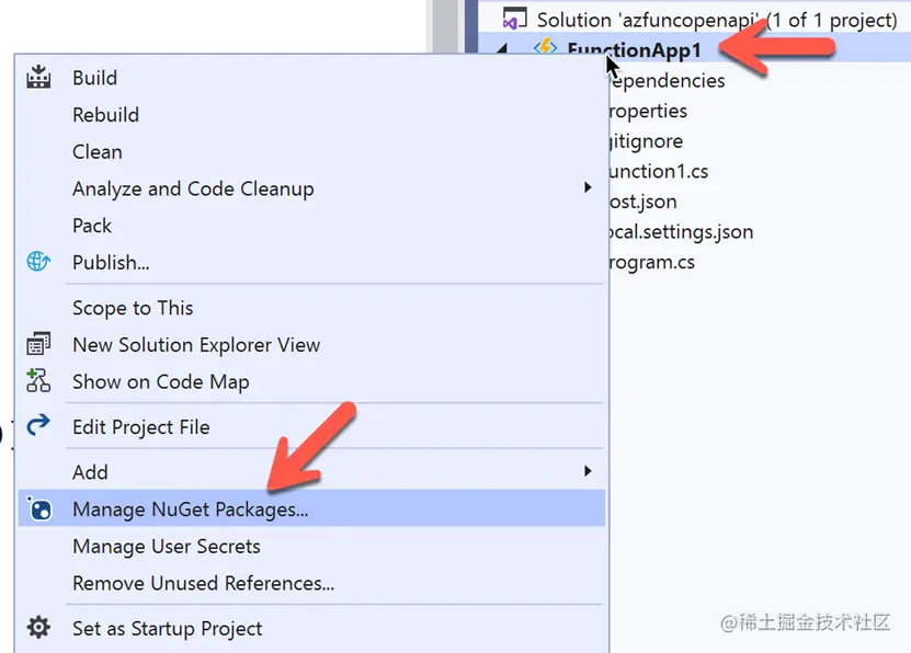 然后您将找到带有默认代码的HTTP端点。现在,在解决方案资源管理器上选择NuGet包管理器菜单。