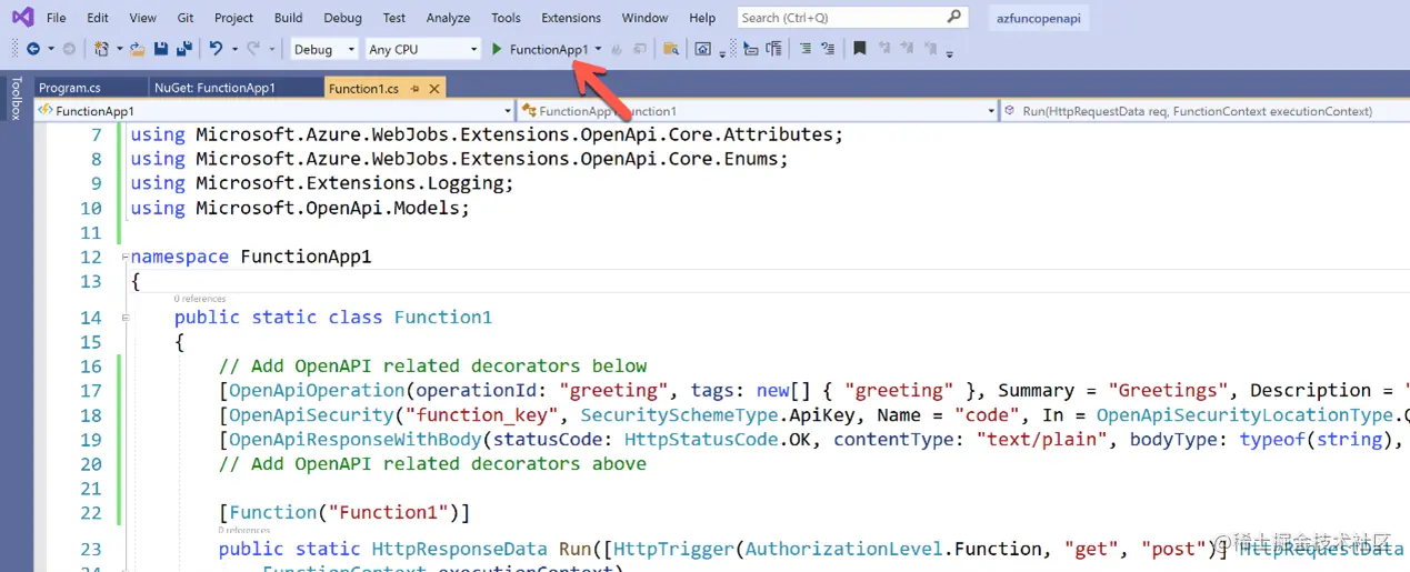 通过输入 F5 键或单击 Visual Studio上的调试按钮运行Function应用程序。