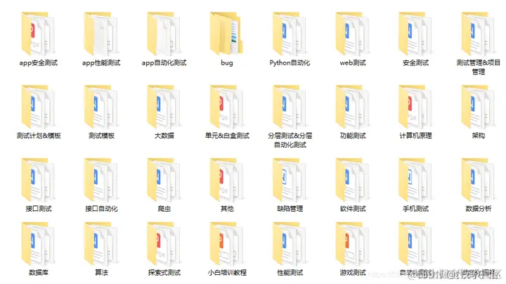 最后我也整理了一些软件测试学习资料,对于学软件测试的小伙伴来说应该会很有帮助,为了更好地整理每个模块,我也参考了很多网上的优质博文和项目,力求不漏掉每一个知识点,很多朋友靠着这些内容进行复习,拿到了BATJ等大厂的offer,这份资料也已经帮助了很多的软件测试的学习者,希望也能帮助到你。需要的小伙伴点这里查看