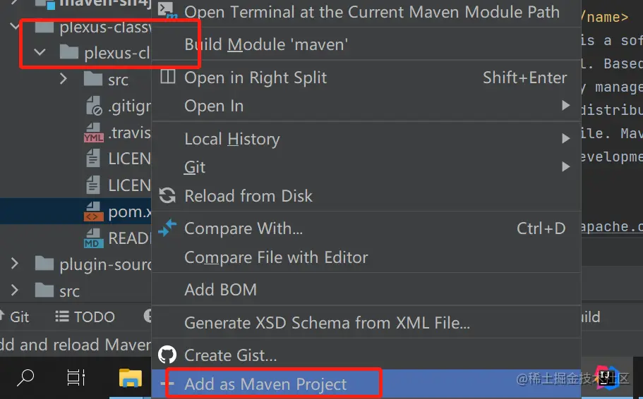 下载了源码后,进行idea导入,导入时,选择这个主目录下的pom,这个pom,就是框架核心的pom,默认只会导入框架核心的maven工程;我们还需要手动,把test-maven-core、plugin-sources、plexus-classworlds-source都导入一下(对着pom右键,Mark As Maven Project即可)。