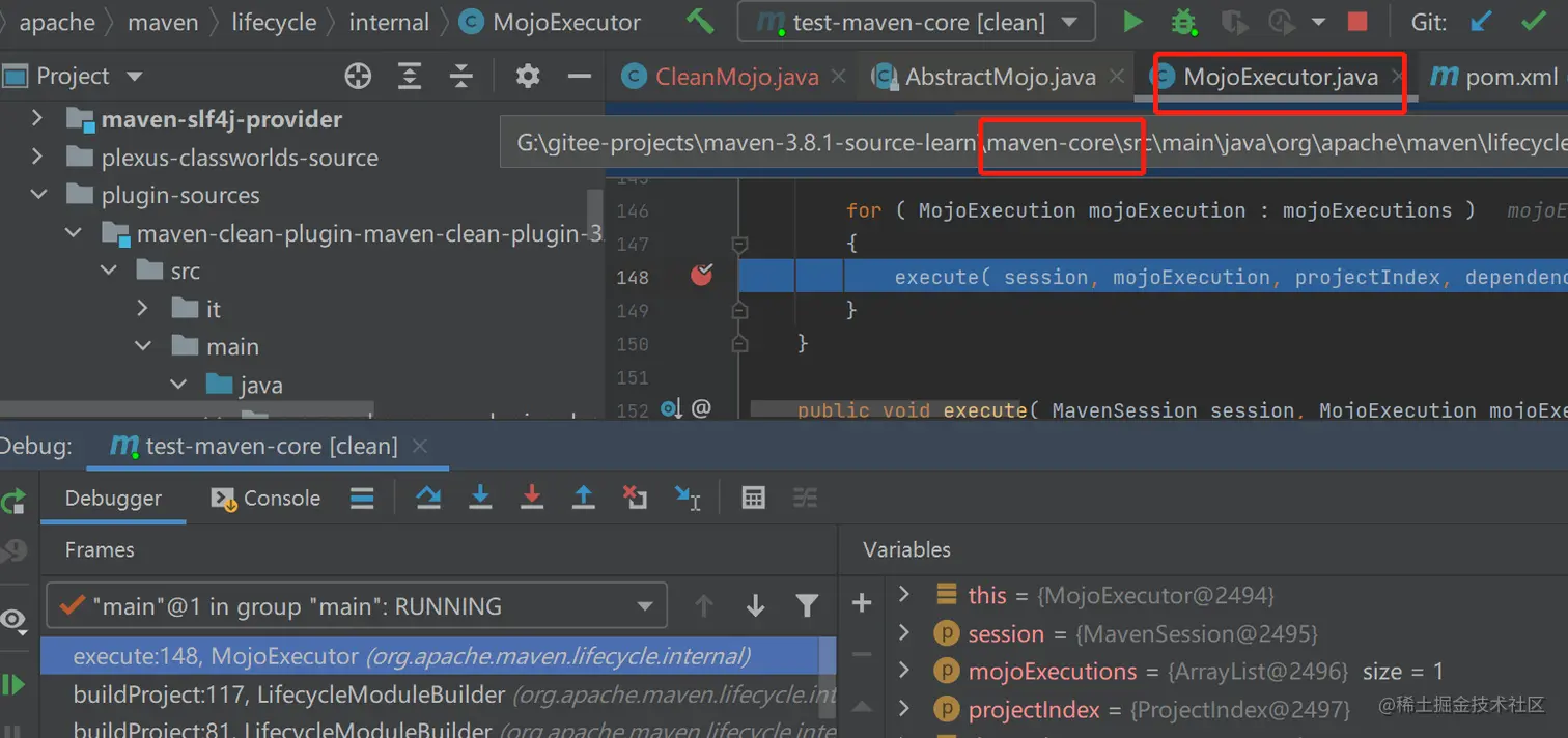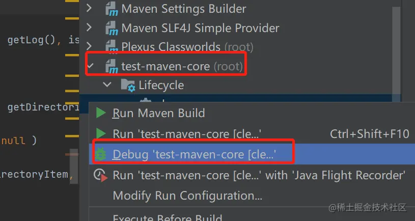 如果大家只是想跟着代码debug,那么,直接在maven框架对应的类上打断点就行了,下图就是在maven core这个module上打断点。
