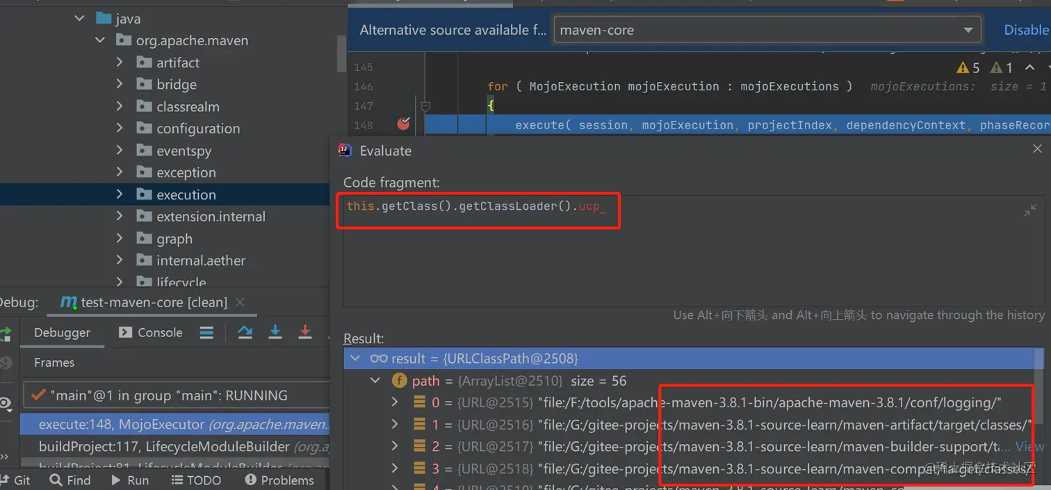 为了验证是否生效,我们随便在maven核心框架打了个断点,看看当前类的类加载器的路径,发现确实已经ok了。