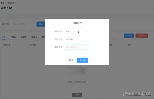 首先拿到前端 GitLab 通用账号的 token,然后通过调用 gitbeaker 获取所有项目信息方法( api.Projects.all({ perPage : 1, maxPages : 1000 }) ),并存储到 Mysql 的 projects 表中。