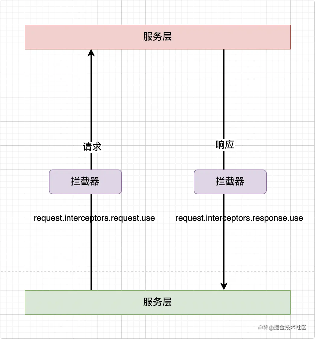首先,拦截器的机制,如下图所示。我们可以通过拦截器的机制分别对请求前、响应后做一些中间件处理的过程。