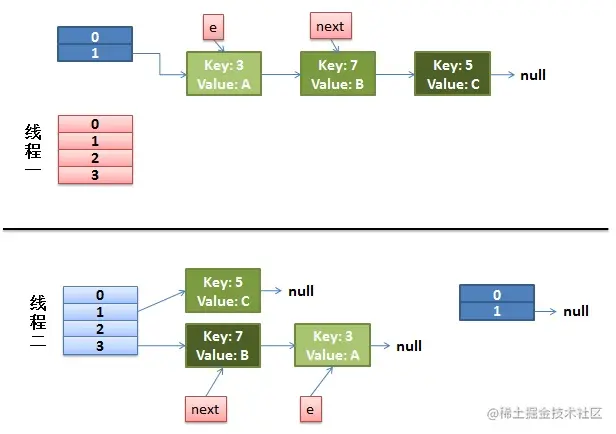 线程一接着工作。把key(7)摘下来,放到newTable[i]的第一个,然后把e和next往下移。这个元素所在的位置上已经存放有其他元素了,那么在同一个位子上的元素将以链表的形式存放,新加入的放在链头,而先前加入的放在链尾。