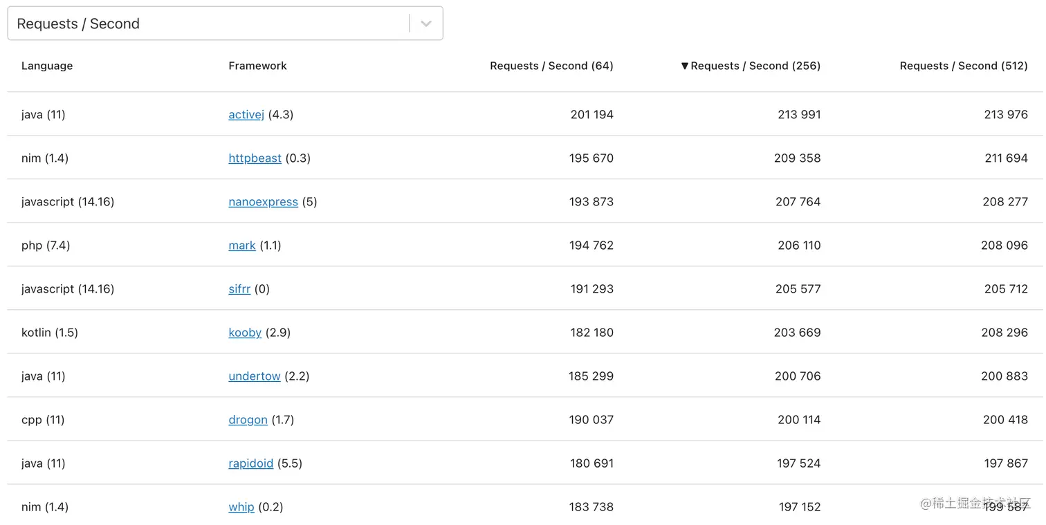 web-frameworks 测出来的平均每秒处理请求数,从高到低排序: