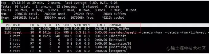 top -Hp 3033,显示一个进程的线程运行信息列表。按下P,进程按照cpu使用率排序