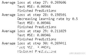 你可以看到MSE损失是如何随着训练量的增加而下降的。这是一个好兆头,表明模型正在学习一些有用的东西。你可以将网络的MSE损失与你做标准平均时得到的MSE损失(0.004)进行比较。你可以看到,LSTM比标准平均法做得更好。而且你知道,标准平均法(虽然不完美)合理地遵循了真实的股票价格变动。