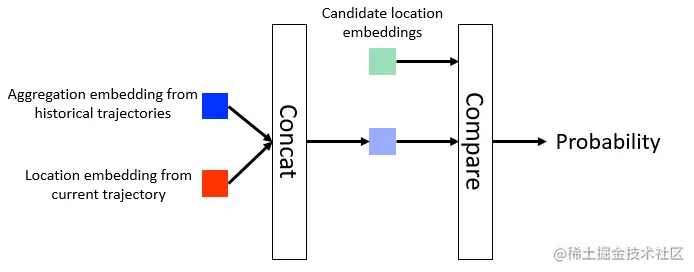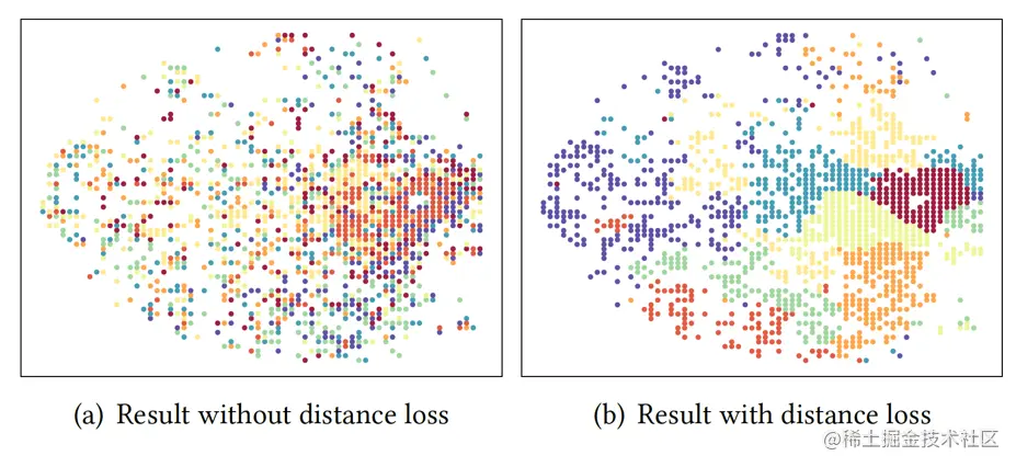 在轨迹数据高度稀疏的场景下,交叉熵损失不能很好地捕捉空间邻近性,而空间邻近性是人类移动恢复的重要特征。因此,我们设计了一个距离损失函数,以纳入空间邻近信息的模型,并且采用了 Noise Contrastive Estimation (NCE)来加速模型的训练,可视化结果显示,加入了Distance Loss能够有效帮助模型捕捉空间邻近信息