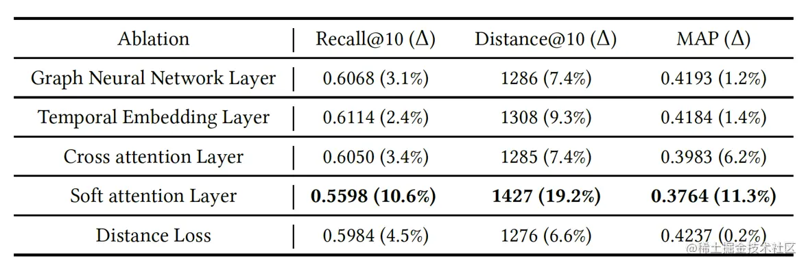 我们对模型五个部分分别进行了消融实验,从实验结果中可以看出每个模块对于我们的任务都有一定的贡献,其中Soft Attention Layer模块去掉后,模型效果下降最快,说明人类移动轨迹数据恢复任务中多层次周期性起着非常大的作用