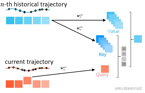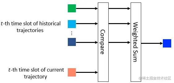 在经过Cross Attention Layer后,每一条历史轨迹的每个时刻的轨迹点表示可以理解为根据当前待补全轨迹的每个时刻进行了偏移校准。接下来在Soft Attention Layer中,我们将当前轨迹的第t时刻与每一条历史轨迹的第t时刻的轨迹表示进行一个attention操作,形成一个包含历史轨迹中的多层次周期性的历史轨迹表示