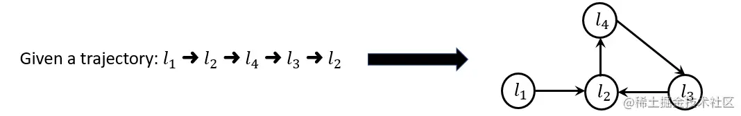 为了捕捉轨迹中轨迹点之间复杂的空间转移关系,我们首先将每条轨迹按照如图所示方式进行建图,然后利用图神经网络来学习有向图中轨迹节点之间复杂的空间转移模式