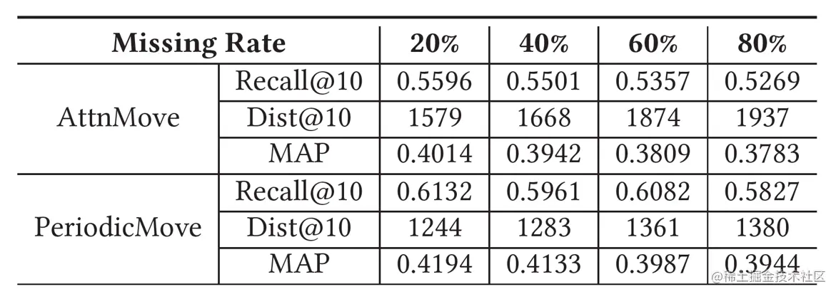 我们将本模型与最新的SOTA模型(2021-AAAI)进行一个在不同缺失率下的鲁棒性实验,从实验结果中可以看出,两个模型都具有较好的鲁棒性,但是我们的模型在各个缺失率下的效果都在AttnMove上有一定的提升