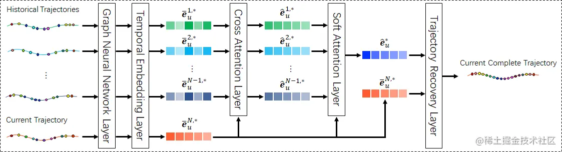 在最后的融合恢复层,我们利用包含复杂时空依赖关系、包含多层次周期性且克服了周期偏移现象的历史轨迹增强序列辅助当前轨迹来进行最后的补全恢复