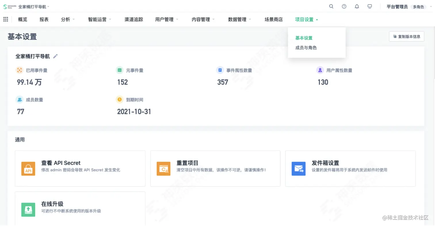 在管理场景中,此次升级侧重于效率的细节提升,将“基本设置”“成员与角色”等设置统一到“项目设置”入口中,基本设置囊括了项目相关的全部设置;将“数据中心”纳入导航栏中,改为“数据管理”,各类管理职能划分更为一致,避免入口分散,有效提升企业管理效率。