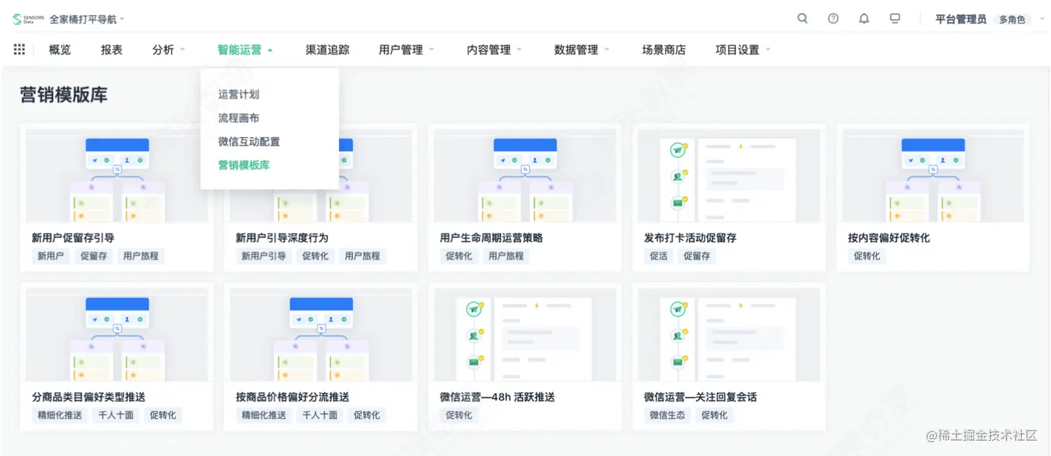 神策分析 2.3 支持神策分析云与神策营销云的全面联动:通过用户分群联动神策用户画像,将用户数据在多场景下全面打通,提升对业务决策的指导能力;通过 A/B 测试对多个运营计划进行效果分析,辅助最佳策略选择,提升数据驱动能力;通过广告投放分析打通前后端数据,全链路呈现广告价值,交叉对比各广告渠道、创意、素材效果,持续优化广告投放决策,提升 ROI;基于不同用户分群在不同场景下的运营需求,创建营销模板或从营销模板库中选择最合适营销工作流,辅助运营策略制定,全面提升运营效率……