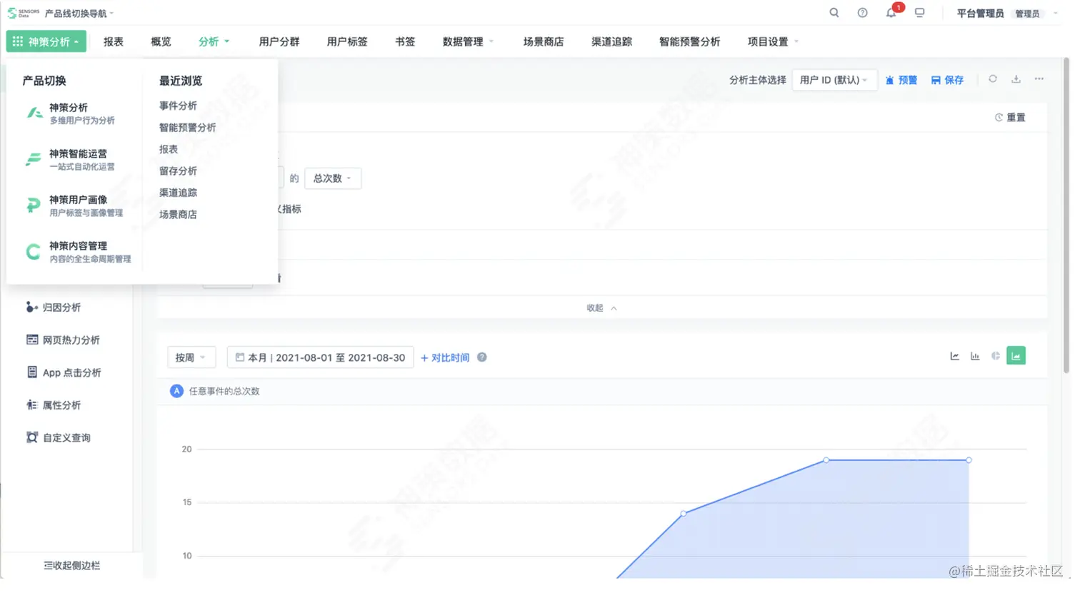 导航栏作为承载神策数据权限产品组件的平台,是诸多功能组件的应用入口和平台的管理入口,能够让用户更清晰、快速地找到所需要的资源。神策数据此次全面升级神策分析的导航栏,将神策产品组件使用与管理统一入口,有效提升用户从感知、决策、行动到反馈的业务效率。