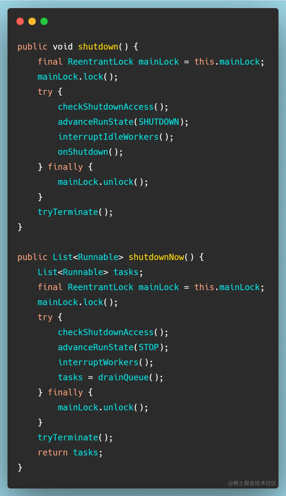 ThreadPoolExecutor中有两个方法可以让线程池关闭,如下: