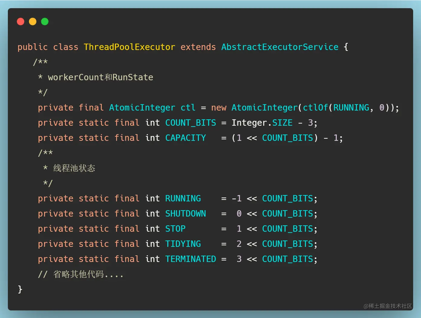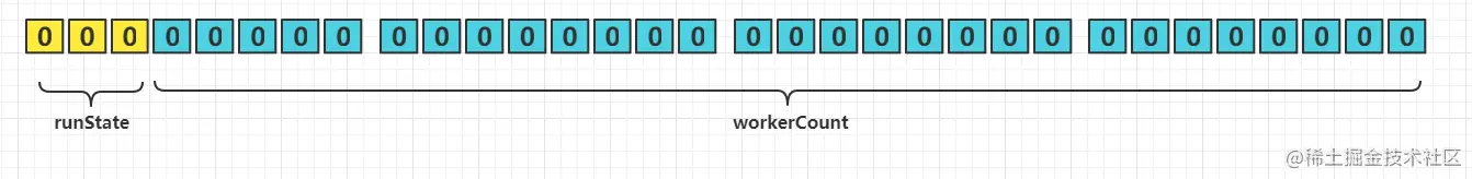 我们看到在最上面有定义一个AtomicInteger ctl这样一个原子类型的Integer,这个ctl不光可以表示线程池的运行状态,同时能够表示线程池的有效线程数workerCount。那么是怎么做到的呢?我们都知道Integer类型的内存大小是4个字节,对应32个bit,ctl将32位的高三位用来表示线程池的运行状态,低29位表示有效线程数。