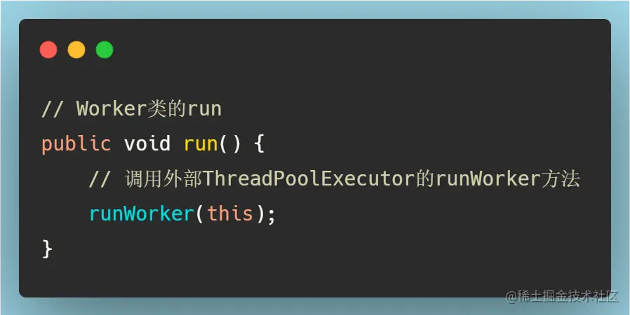 在Worker的run方法中直接调用外部类ThreadPoolExecutor的runWorker(Worker)方法。