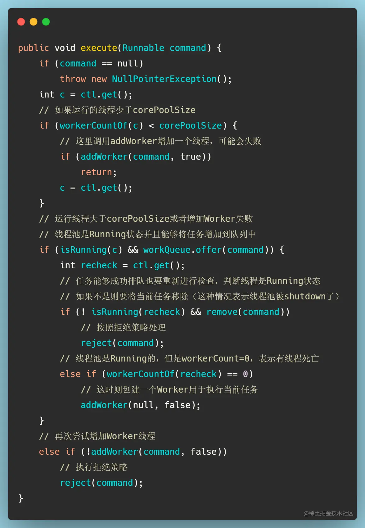 - 如果在第二步入队失败,会再次尝试增加一个Worker执行该任务,如果这里还是不行,则表示线程池确实shutdown或者等待队列满了,就执行拒绝策略。