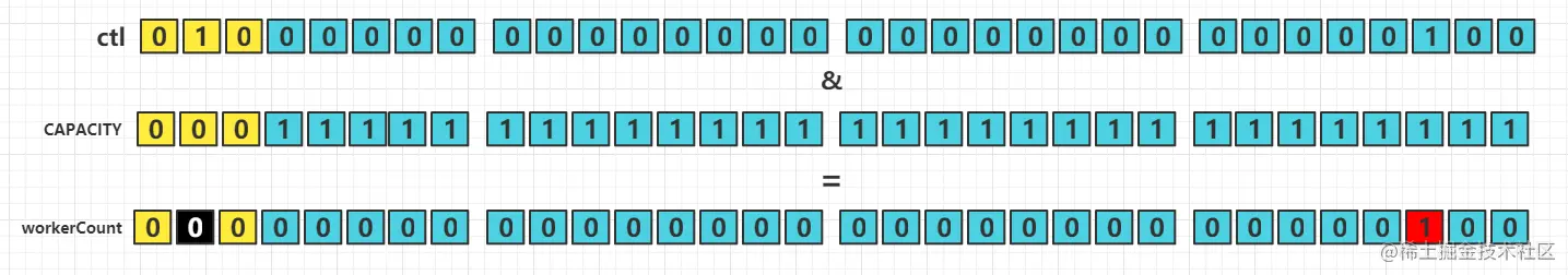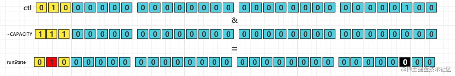 要获取高位的runState则使用ctl的值c和容量(也就是2^29-1)取反做与运算;