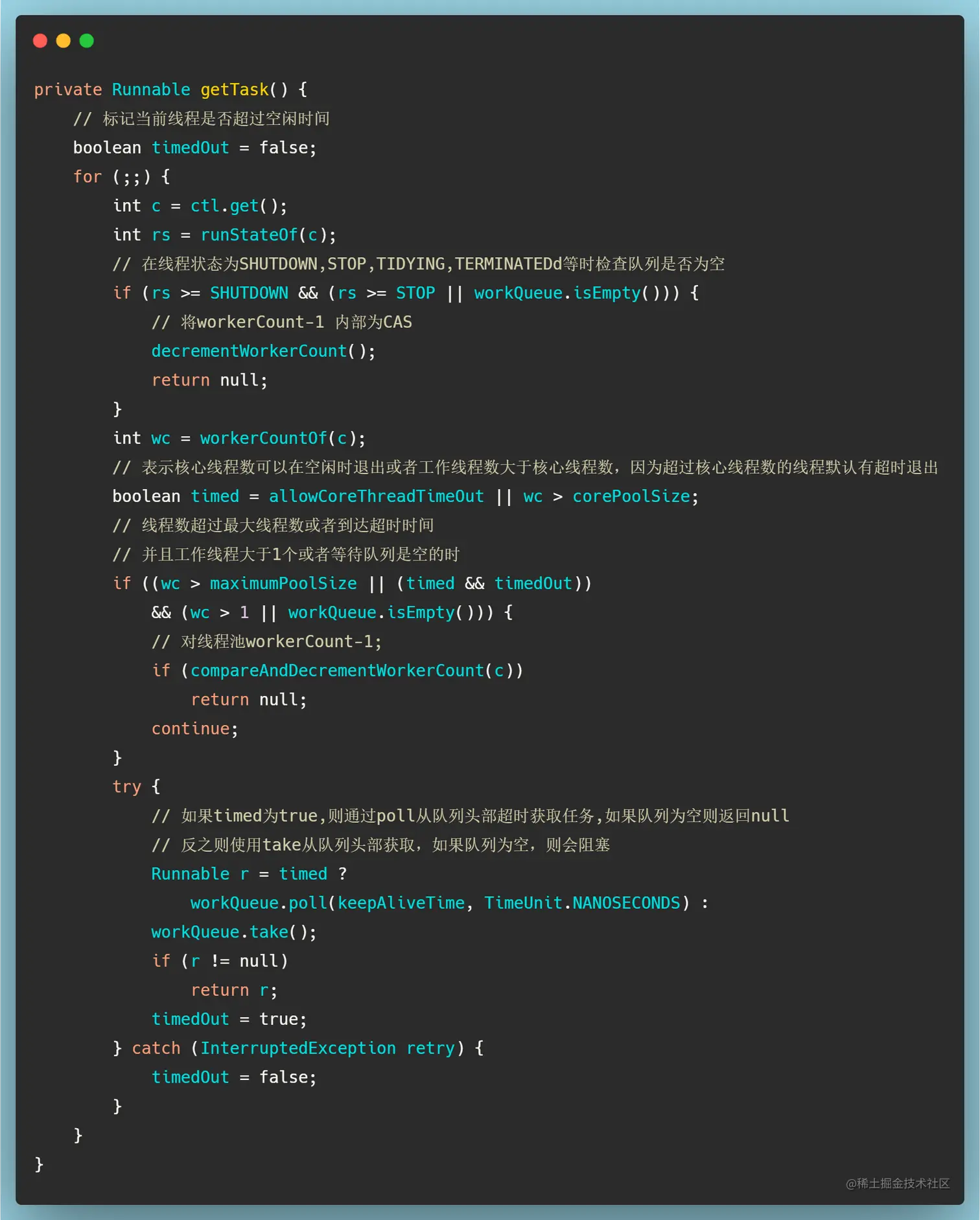 getTask()方法获取任务,如果返回空着该Worker线程则会退出;如果因为外部任务代码导致的异常抛出,则也会终止循环,但是不会将Worker线程退出; - 在运行任务之前都会获取锁防止其他任务执行时发生其他的池中断,并确保在池没有停止的情况下保证该线程不会设置其他中断;
