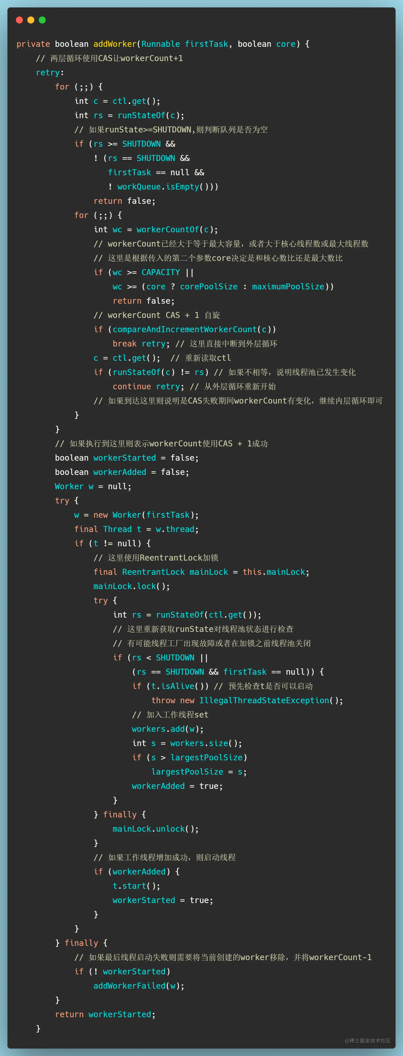 - 如果线程启动失败,则将worke移除,workerCount原子减1