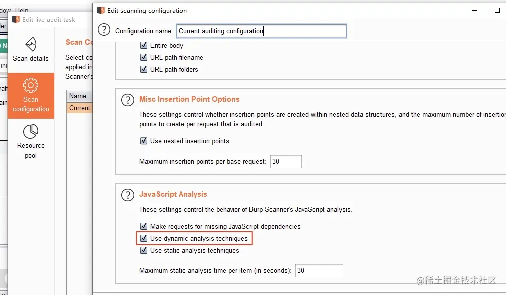 其中JavaScript分析配置中,默认开启了动态分析功能(dynamic analysis techniques)、额外请求功能(Make requests for missing Javascript dependencies)